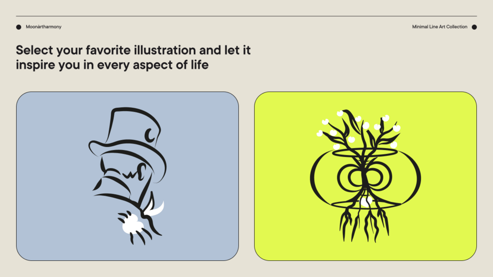 Discover "Moonartharmony's Minimal Line Art Collection", a linear form that captures the essence of minimalism, where each line tells a different story. This concept consists entirely of customized hand drawings. Now meet a world accompanied by the power of inspiration.